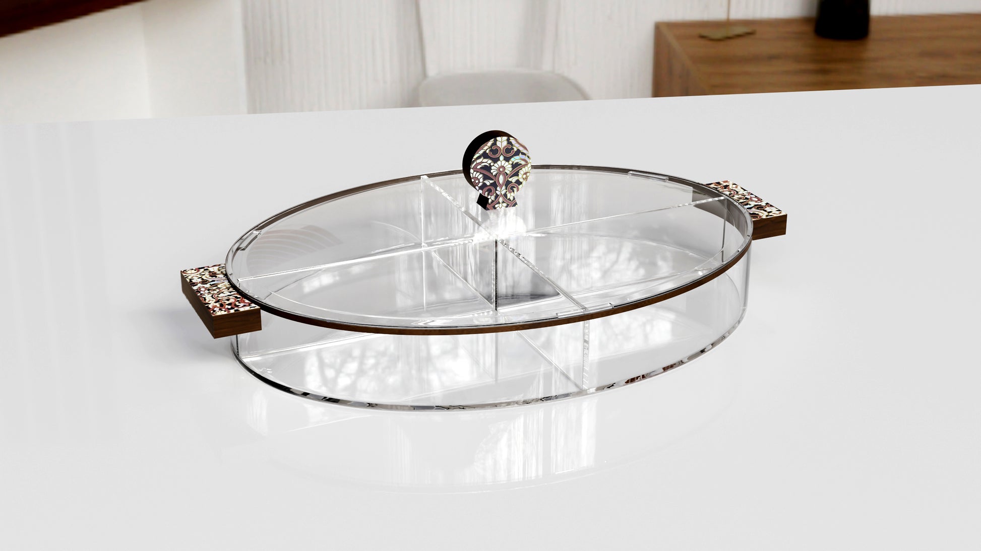 Compact yet versatile, this small candy box with four compartments is ideal for presenting nuts, chocolates, or dried fruits. Its thoughtful design allows for easy sharing while maintaining a refined tabletop presence.