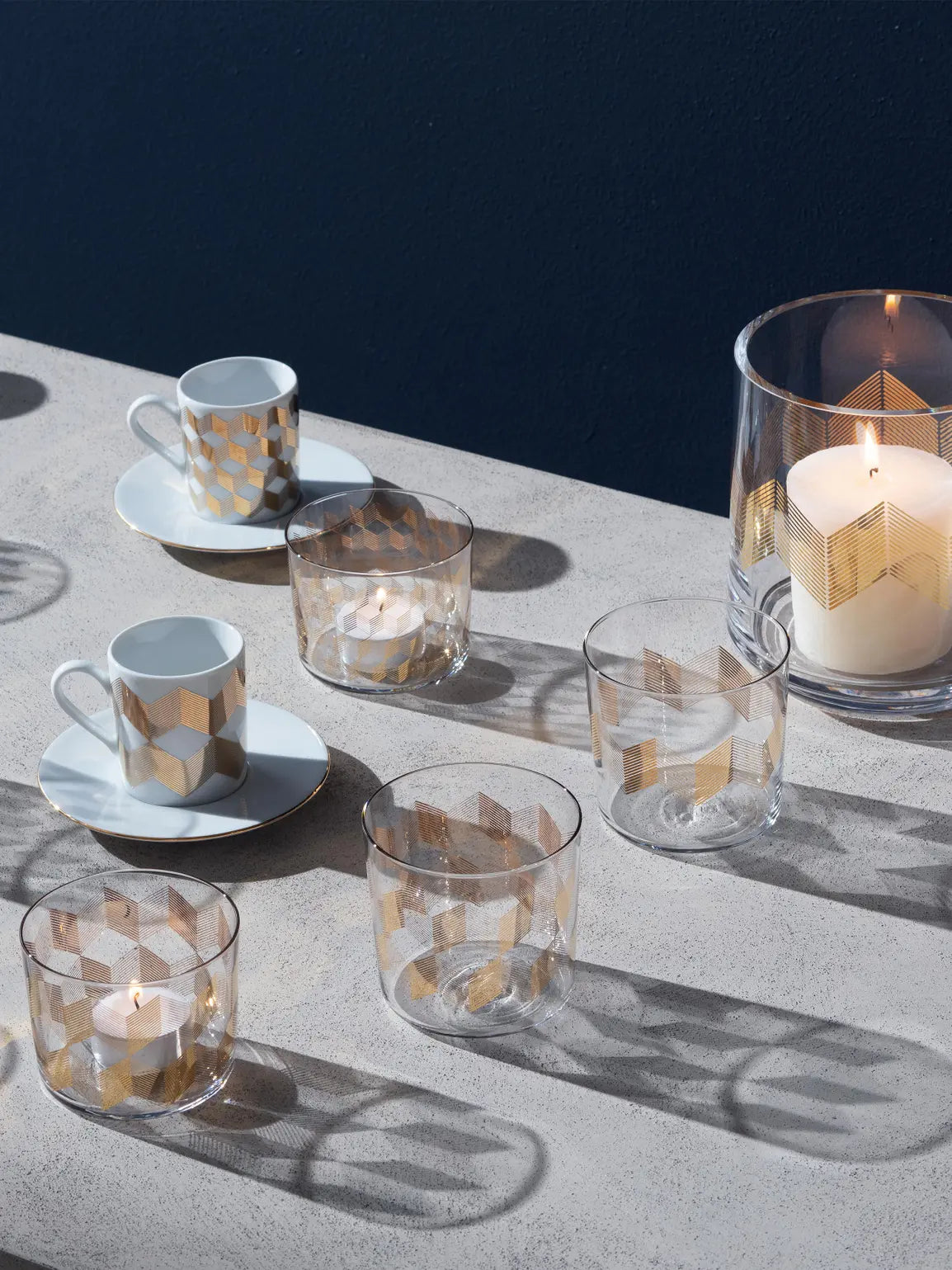A set of four porcelain cups decorated with assorted gold chevron motifs. The rims of the saucers are hand-painted using paint with 24 karat gold content. Inspired by 20th century architectural decoration.