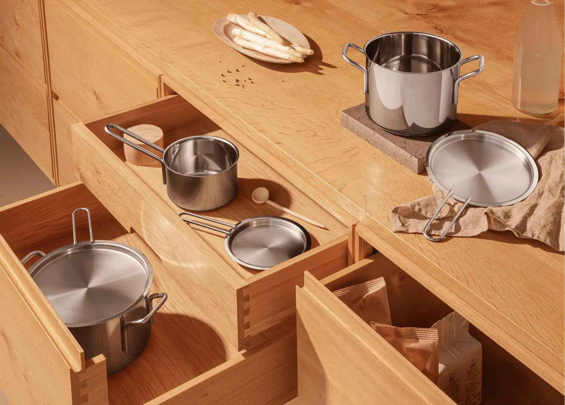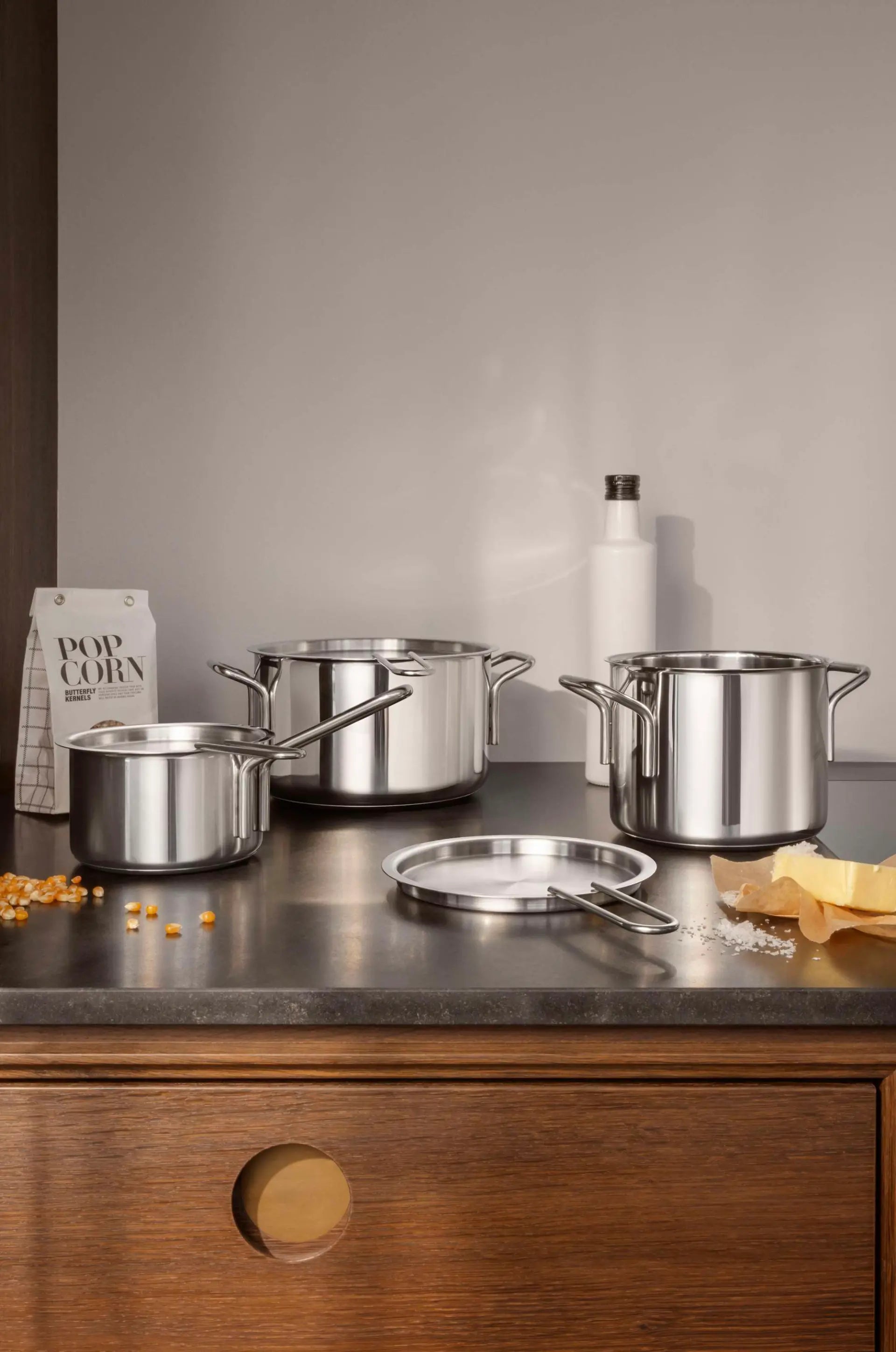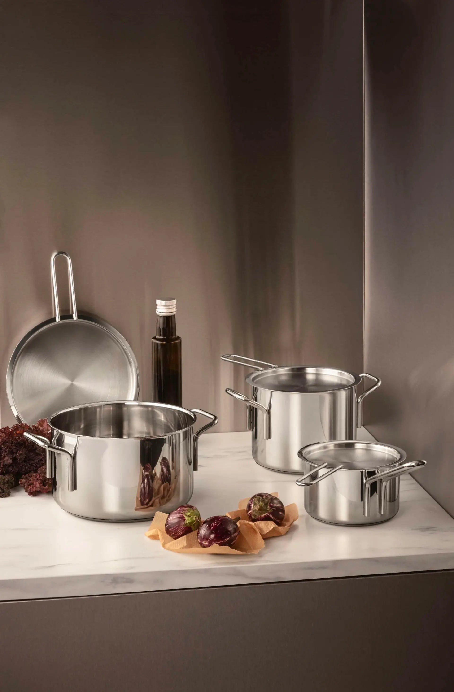 The flat stainless steel lids can either be stacked on top of one another or suspended from hooks. The lids have a long handle positioned on the side, enabling you to check the food without burning yourself. During cooking you can also keep things warm on the lid.