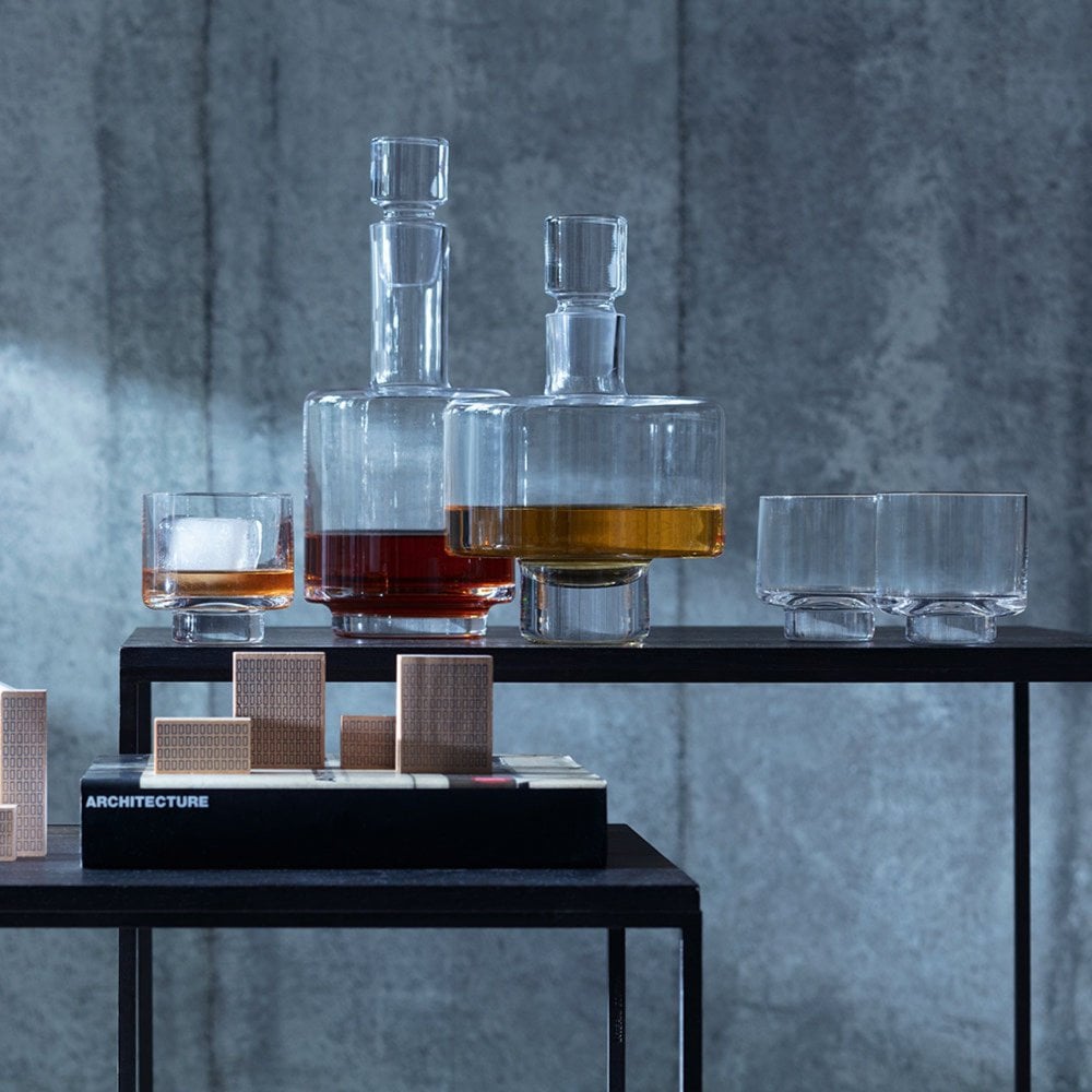 Mouth blown by master glassblowers, this decanter's graphic silhouette is inspired by the geometry of Brutalist, Eastern Bloc architecture. Each decanter's stopper is ground by hand to fit within the neck of the individual decanter.