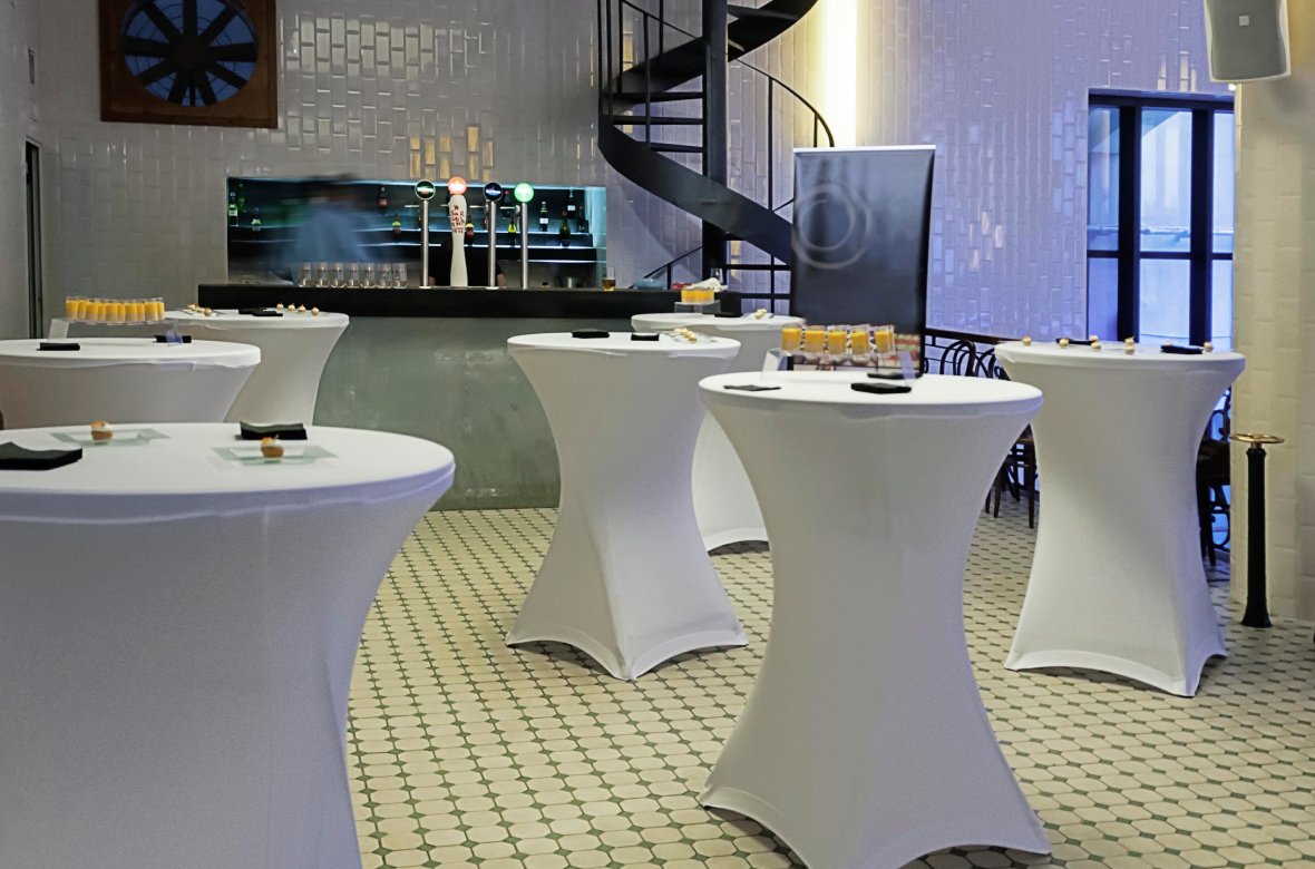 High round folding table Ø80cm for cocktails or appetizers (H110cm) at celebrations or conferences. For those events where seamless interaction between the users, who are standing or sitting on high stools, is sought.