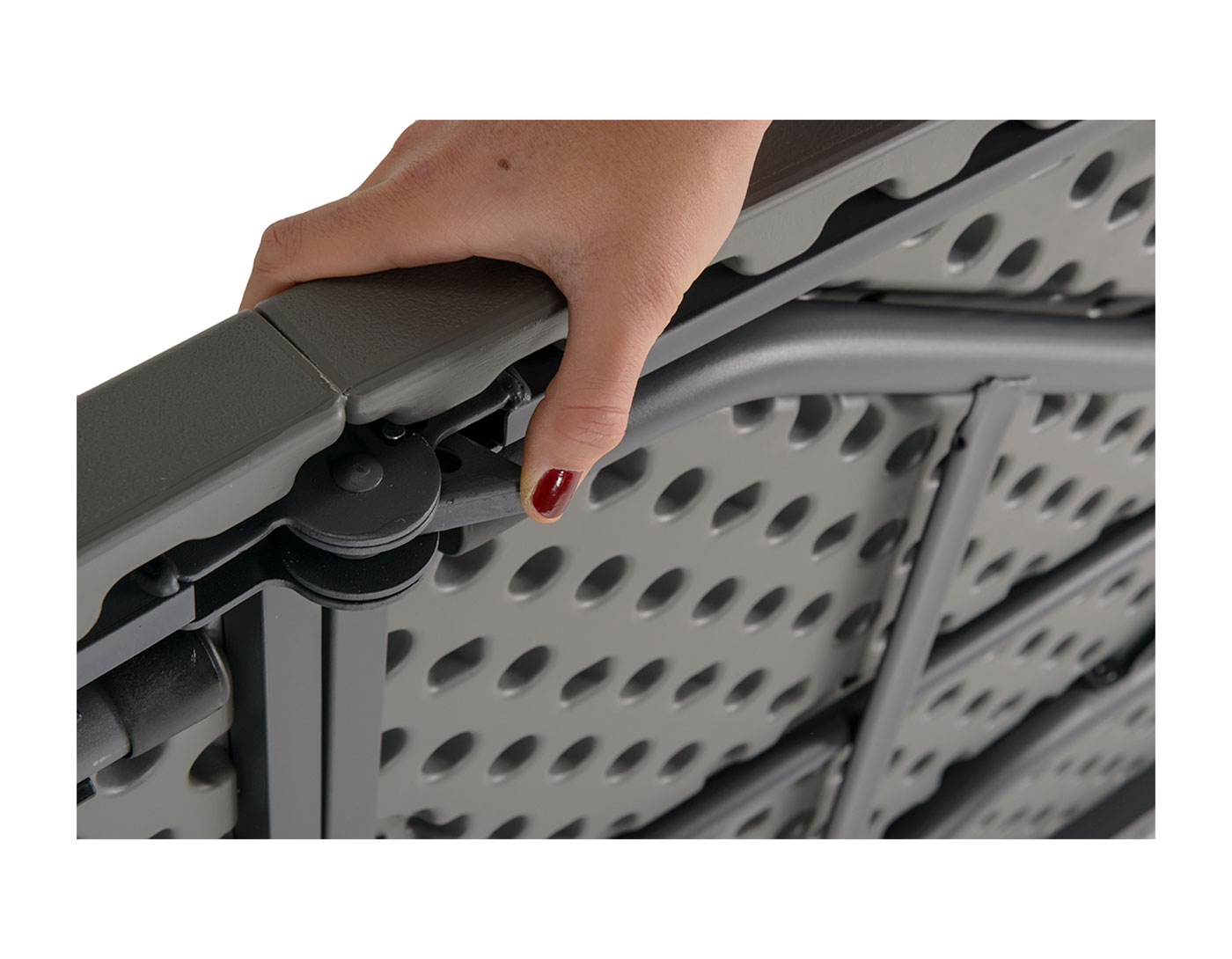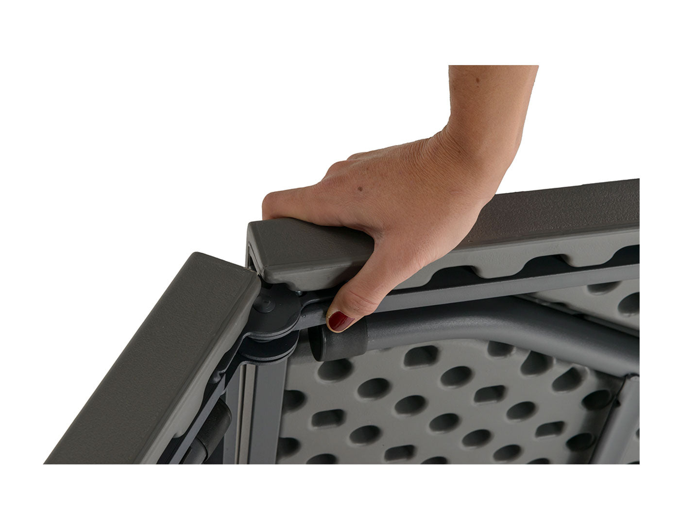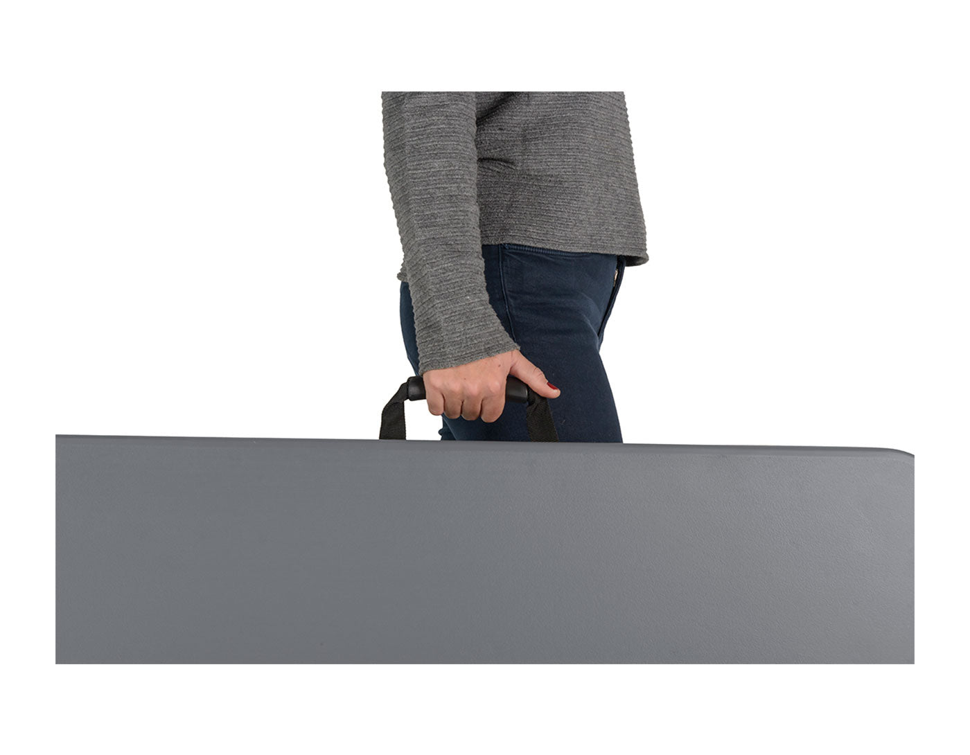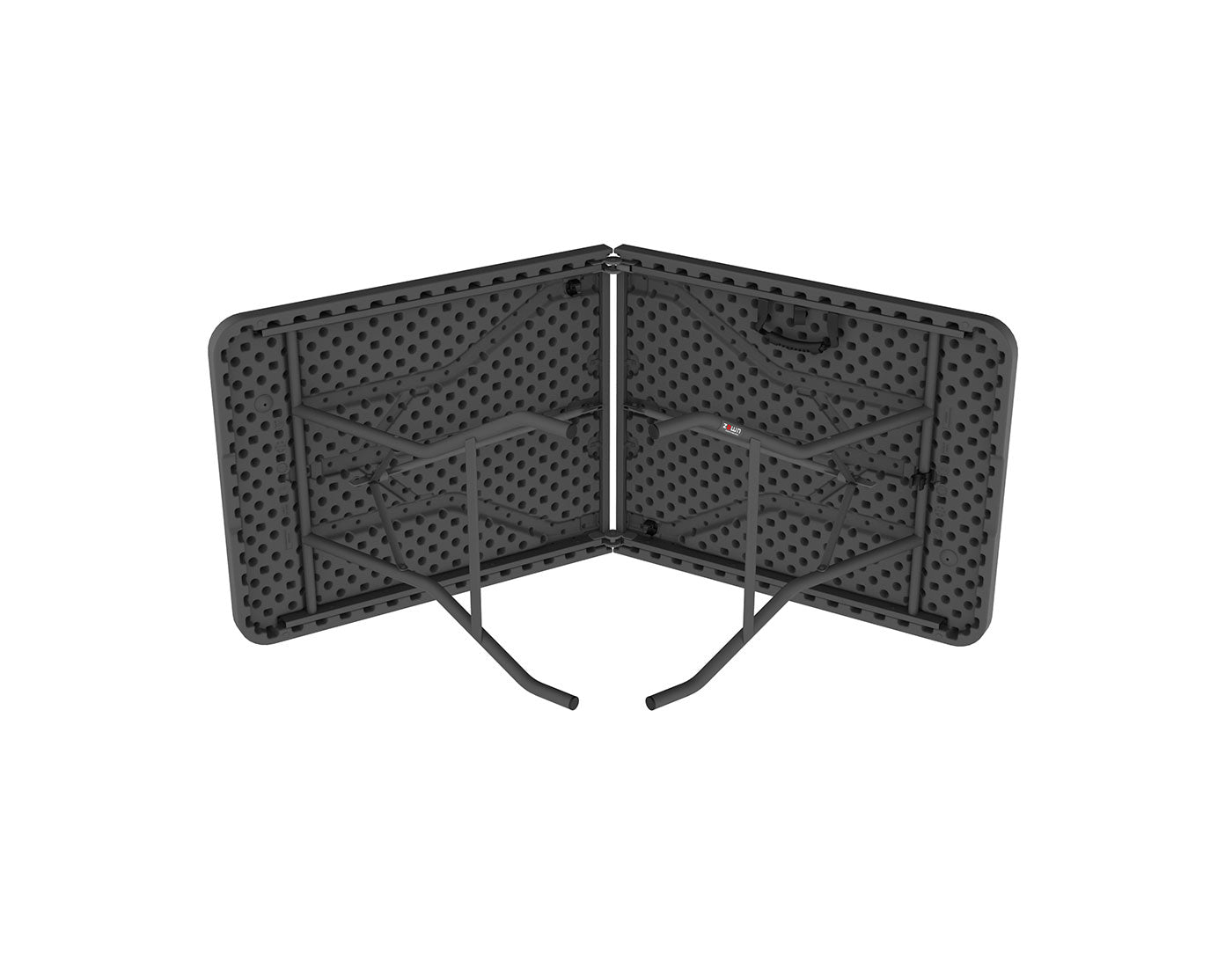 Table measuring 183 x 75 cm with a mid-folding top and a carrying handle, like a suitcase. The folding table top facilitates the table’s handling and storage.