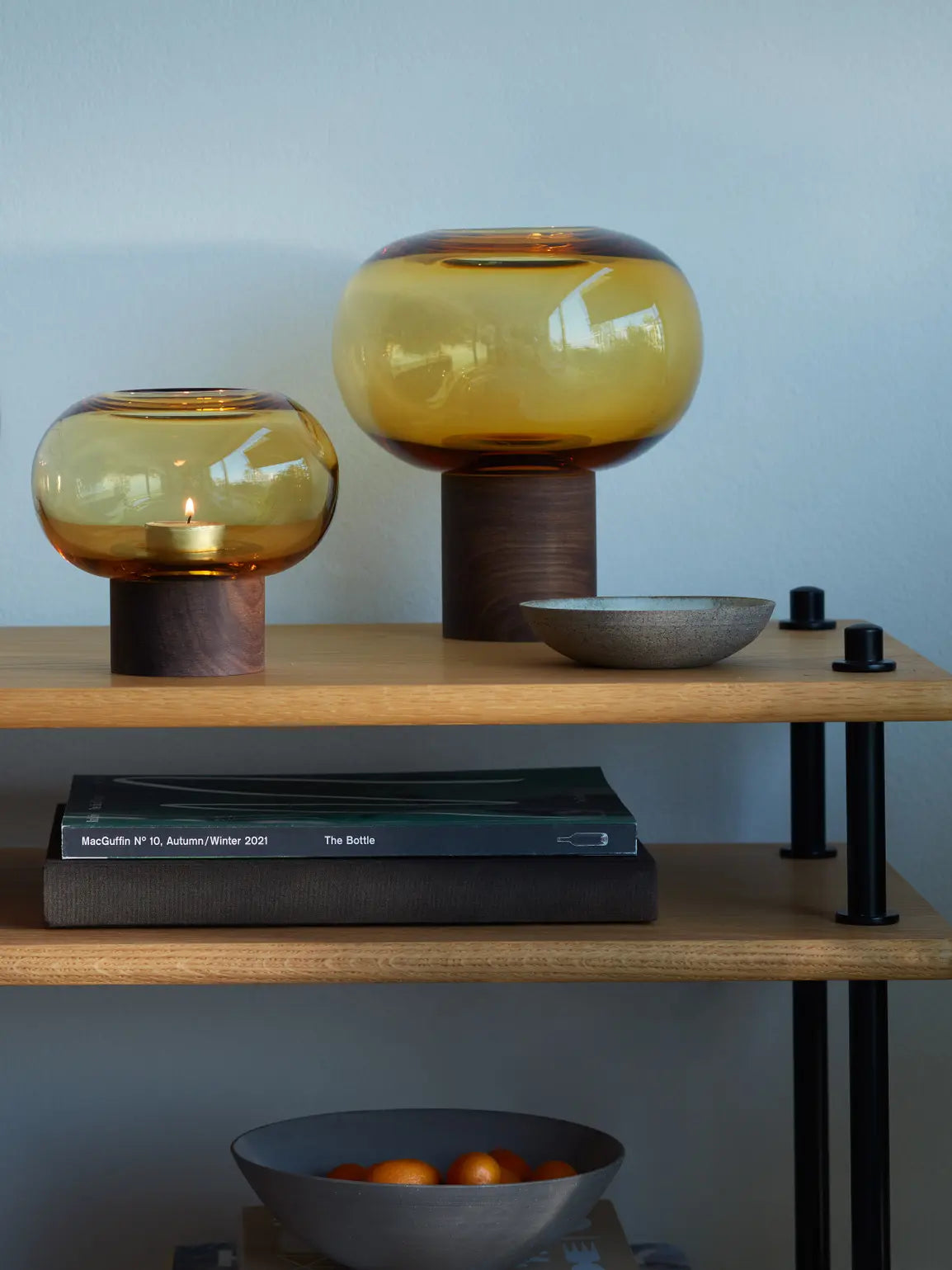 A mouth-blown vase/lantern with flattened, spherical shape and pillar stem which is located in a walnut wood base. Suitable for use as a vase, planter or lantern, or simply displayed as a decorative object.