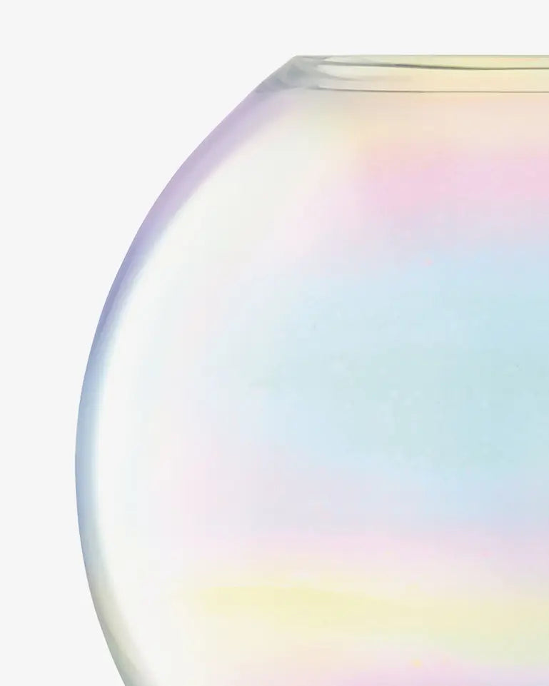 A small mouth-blown glass vase with a spherical shape. Mouth blown by skilled glassblowers to create a globe-shaped vase. The rim is cut and polished for a flat smooth edge. Hand painted with an iridescent luster and fired to achieve the pearlescent finish.