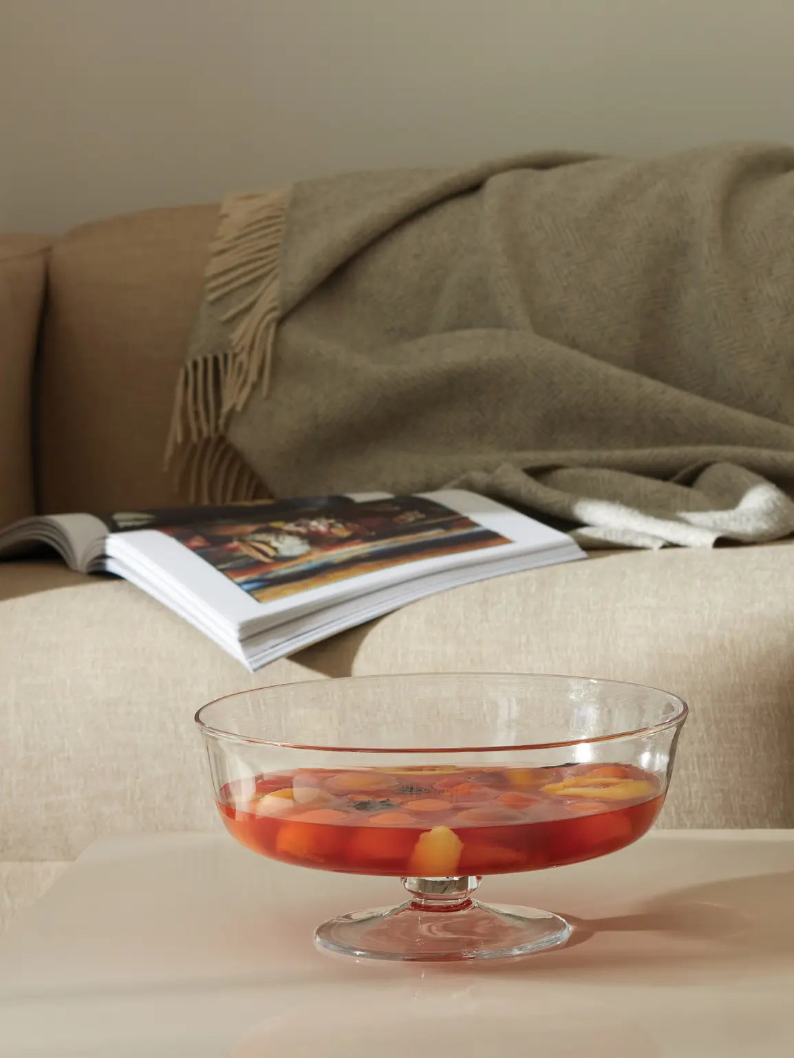 A wide mouth-blown glass comport with a flared shape and rounded stem. Designed for desserts or fruit.